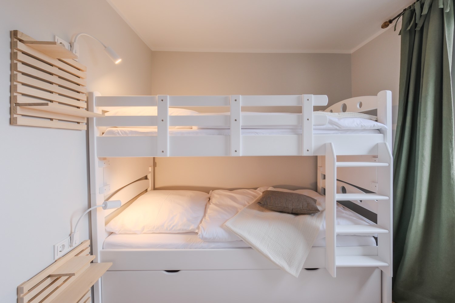 Ihr schlaft in tollen Kingsize-Doppelbetten, 1,80 x 2,00 m im Schlafzimmer. Unser hochwertiges Doppelstockbett 90 x 2,00 m mit vollwertiger Matratze erwartet Euch im anderen Schlafzimmer. Hier befindet sich auch das 5te Bett (90 x 1,90 m), das als Bettschublade unter dem Doppelstockbett herausgezogen wird. Unsere Betten sind alle für Allergiker geeignet.